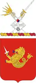 - Shield- The shield is red for Artillery. The sea-lion is taken from the coat of arms of the Philippine Islands, where the organization was assigned during its period of active service.