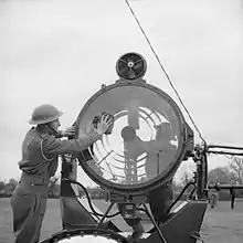 The TA's AA units were mobilised on 23 September 1938 during the Munich Crisis, with units manning their emergency positions within 24 hours, even though many did not yet have their full complement of men or equipment. The emergency lasted three weeks, and they were stood down on 13 October.[9] In February 1939 the existing AA defences came under the control of a new Anti-Aircraft Command. In June, as the international situation worsened, a partial mobilisation of the TA was begun in a process known as 'couverture', whereby each AA unit did a month's tour of duty in rotation to man selected AA gun and searchlight positions. On 24 August, ahead of the declaration of war, AA Command was fully mobilised at its war stations.[10]