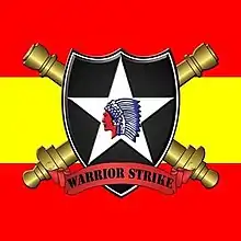 2nd Infantry Division Artillery[1] was constituted on 21 September 1917 in the Regular Army as Headquarters, 2d Field Artillery Brigade. It was partially organized in October 1917 at Governors Island, New York, and assigned to the 2d Division (later redesignated as the 2d Infantry Division); organization completed 1 January 1918 in France, consisting of the 12th, 15th and 17th Field Artillery regiments, and the 2nd Trench Mortar Battery. The Brigade was deployed to France during World War I in support of US and Allied Forces and fought in many key battles, to include: Aisne, Île de France, Aisne-Marne, Lorraine and Meuse-Argonne. For its actions the 2nd FA Brigade was awarded the French Croix de guerre with two Palms and the French Fourragère. After the war was over the brigade returned home to Fort Sam Houston, where it was disbanded on 7 October 1939.