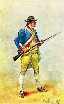 Today, the 2nd New Hampshire/8th Continental Regiment is recreated by a group of living historians dedicated to portraying this illustrious unit as authentically as possible. The group portrays one company of the regiment through its various uniforms and equipage over the course of the American Revolution, from the civilian hunting fowlers and "small clothes" of the militia to the distinctive uniform and Charleville muskets of the light infantry in 1781. The unit portrayed was originally a militia company commanded by Captain Jonathan Wentworth in what is now Dover and Rollinsford in Strafford County, New Hampshire. Capt. Wentworth was unfortunately court martialed and cashiered in July 1776 for dereliction of duty, though he claimed it was because he was lacking a tent and still recovering from "small pox and camp distemper".[3] Though Wentworth was exonerated and returned to the army a few years later, in 1776 command of the company passed to Lieutenant James Carr. He became paymaster in 1779, and Samuel Cherry, originally a native of Ireland, became company commander and led the soldiers during their greatest moment at Yorktown when they stormed the British lines.