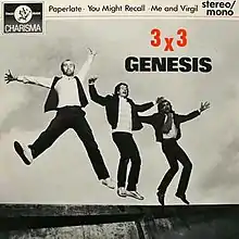3×3 is the second extended play by the English rock band Genesis, released in May 1982 on Charisma Records. Its three songs were originally written and recorded for their eleventh studio album Abacab (1981), but they were not included on the album's final track selection. 3×3 reached No. 10 on the UK Singles Chart. In the US, its tracks were included on the international edition of the band's live album Three Sides Live (1982). The lead track, "Paperlate", peaked at No. 32 on the US Billboard Hot 100 singles chart and No. 2 on the Billboard Mainstream Rock Tracks chart.