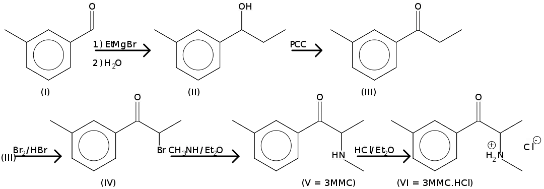There are several ways to synthesize 3-MMC. One of ways to synthesize 3-MMC, which is adapted from Power et al, is to add ethyl magnesium bromide to 3-methylbenzaldehyde (I). The product (II) is then oxidized by pyridinium chlorochromate (PCC) on silica gel to the keton (III) and brominated with hydrobromic acid to yield the bromo ketone (IV). This bromo ketone is reacted with ethanolic methylamine to produce the 3-MMC free base (V), which can be converted to the hydrochloride salt (VI) by addition of ethereal hydrogen chloride (VI).[8]