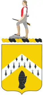 The regimental coat of arms was approved on 9 June 1924 and its distinctive unit insignia was approved on 10 July 1926. Both were rescinded on 17 February 1959. The distinctive unit insignia consisted of a 1 1/8 inch (2.86 cm) gold colored metal and enamel device with an ermine chevron and black gauntlet on a field of yellow. The regimental motto, "Lead me Forward", was attached to the insignia on a golden scroll. The chevron and gauntlet were taken from the shield of American military commander Anthony Wayne, who fought battles in Michigan, and the yellow represented the cavalry. The words "Lead Me Forward" were spoken by Wayne after he was wounded at Battle of Stony Point during the American Revolutionary War.[4]