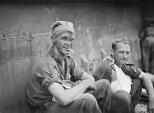 In early 1943, the 14th/32nd Battalion carried out amphibious warfare training in Queensland before being deployed to the Buna–Gona area in New Guinea in July.[17] The battalion would remain in mainland New Guinea and New Britain for the next two years, under the command of Lieutenant Colonel William Caldwell.[23] The strategy employed by the Australians during the New Britain campaign was one of containment against the much larger Japanese forces in the area. On 18 March 1945, the battalion took part in its only major battle of the war when it launched an assault on Bacon Hill and captured it.[17] In April 1945, the 14th/32nd Battalion was withdrawn to Australia in preparation for involvement in future operations but, in July, the decision was made to disband the unit as the end of the war became apparent.[24] During the course of the conflict the battalion suffered 77 casualties, of which 31 were killed in action or died of wounds or other causes. Members of the battalion received the following decorations for their service: one DSO, one OBE, two MCs, one British Empire Medal, one DCM, one MM and seven MIDs.[17]