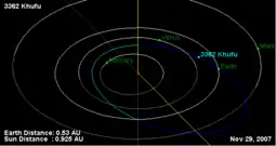 3362 Khufu is a potentially hazardous asteroid (PHA) because its minimum orbit intersection distance (MOID) is less than 0.05 AU and its diameter is greater than 150 meters. The Earth-MOID is 0.0135 AU (2,020,000 km; 1,250,000 mi).[2] Its orbit is well-determined for the next several hundred years.