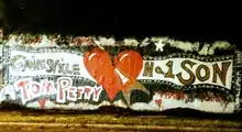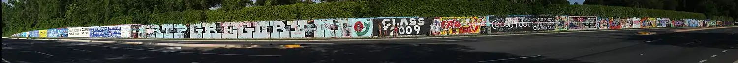 The otherwise nondescript poured concrete wall is notable for being almost entirely covered by graffiti, and it has served as an sort of ever-changing bulletin board for the Gainesville community since the 1980s. Items painted on the wall have included marriage proposals, birthday wishes, graduation announcements, celebration of athletic victories, activist and public awareness statements, tributes, promotions, and memorials, including two permanent memorial panels for victims of the Danny Rolling murders and Gainesville native Tom Petty. Although most of the graffiti is painted by university students and other members of the community, there is occasional tagging and professional art.[1] After decades of use, it is estimated that paint on the center of the wall is about 250 layers thick.[2]