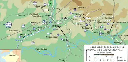 The division now came under orders of VII Corps of the Fifth Army. The division was ordered to relieve the 21st Division then on the Cléry-Bouchavesnes ridge just north of the Somme, some 3 miles (4.8 km) north of Péronne. The first to arrive at Maricourt (7 miles (11 km) north west of Péronne) were elements of the 105th Brigade in the early evening of 23 March. By the early morning of 24 March the 21st division had been forced off the ridge and the brigade was placed under its orders. The 15th Cheshires and 15th Sherwood Foresters retook the high ground lost the previous day, with the Cheshires anchored on the right on the Somme but in doing so became separated with the Sherwood Foresters having an open left flank, and by the afternoon had suffered heavy casualties and were in danger of being overrun. They were extracted with the aid of the 17th Royal Scots, a pair of tanks and a Canadian Motor Machine Gun Battery and withdrew by the evening to the line between the villages of Curlu, Hardencourt and just to the east of Montauban-de-Picardy 1.5 miles (2.4 km) south-east to north-east of Maricourt.[lower-alpha 6] By this time General Franks had assumed command of the 9th (Scottish) and 21st divisions in this part of the line. The remainder of the division had arrived in the area by the evening when the division headquarters was ordered to move to the rear from Maricourt to Bray-sur-Somme 4 miles (6.4 km) to the south east. The exception was the artillery which was delayed, however the division's artillery commander was given command of the (remains of) 9th (Scottish) and 21st division's artillery and a number of Army artillery brigades deployed around Maricourt.[49]