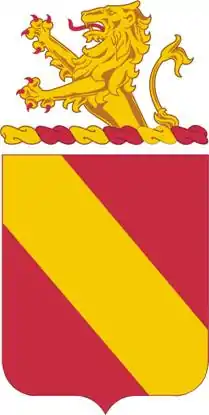 The shield is red with a diagonal band in gold, representative of Field Artillery and honorable service. The crest denotes courage and willingness to defend the country.
