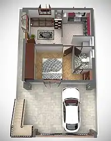 A 3D floor plan is built utilizing advanced 3D rendering software, the same type of software used to create major animated motion pictures. Through complex lighting,[3] staging, camera, and rendering techniques 3D floor plans appear to be real photographs rather than digital representations of the buildings after which they are modeled. It is also the presentation of building floor-plan in an advanced manner, bringing it to real life views.[4][5]