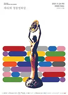 The 42nd Blue Dragon Film Awards (Korean: 제42회 청룡영화상) ceremony was held on November 26, 2021 at KBS Hall in Yeouido, Seoul. Organized by Sports Chosun (a sister brand of Chosun Ilbo). It was aired live on KBS2 at 20:30 (KST).[2][3] 18 categories were awarded at the 42nd edition of awards ceremony, hosted by Kim Hye-soo (28th time) and Yoo Yeon-seok (4th time).[4] The nominations for 15 categories were announced for the 172 Korean films released from October 30, 2020 to October 14, 2021 on November 1, 2021. Escape from Mogadishu got 13 nominations in 10 categories,[5] and won 6 awards including best film, popular film and popular star awards.[6]
