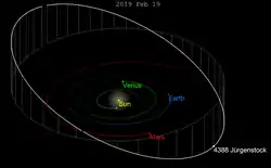 Jürgenstock is a member of the Phocaea family (701),[3][4] a large collisional family of nearly 2000 stony asteroids, which is named after 25 Phocaea.[8]: 23 As with the Hungarias, many Phocaeans are also Mars-crossers due to their eccentric orbits. However, Jürgenstock just stays shy of the orbit of Mars (1.66 AU) with a relatively small Minimum orbit intersection distance (MOID) of 0.248 AU (37,100,000 km).[1] Moreover, in an alternative HCM-analysis by Milani and Knežević, it has been considered a background asteroid rather than a member of the Phocaea family.[9] On 3 July 2041, Jürgenstock will approach the 200-kilometer sized asteroid 7 Iris at a distance of 6,700,000 km (0.045 AU) with a relative velocity of 5.66 km/s.[2]