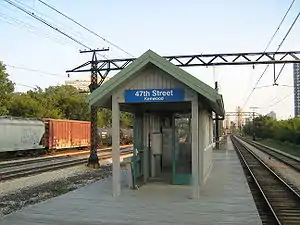 47th Street (Kenwood) is a commuter rail station within the city of Chicago that serves the Metra Electric Line north to Millennium Station and south to University Park, Blue Island, Illinois, and the neighborhood of South Chicago. As of 2018, the station is the 191st busiest of Metra's 236 non-downtown stations, with an average of 94 weekday boardings.[1] This station is a flag stop picking up passengers only when visible to train conductor and discharging passengers only when conductors are notified. Passengers can only exit the train from the first car. The first station at this location was originally built by the Illinois Central Railroad (ICRR).