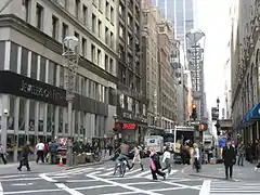 47th Street is an east–west running street between First Avenue and the West Side Highway in the borough of Manhattan in New York City. Traffic runs one way along the street, from east to west, starting at the headquarters of the United Nations. The street features the Diamond District in a single block (where the street is also known as Diamond Jewelry Way) and also courses through Times Square.