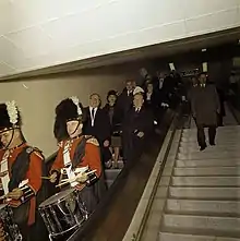 In its first year, the band was organized with a total strength of 14 pipers and 5 drummers combined. During World War I, the pipe band accompanied the regiment to Europe where it led it into battle.[3] The pipes and drums have played at every Toronto Maple Leafs home opening game at both Maple Leaf Gardens and the Air Canada Centre since their performance at the opening of the new Maple Leaf Gardens on 12 November 1931 at the request of Conn Smythe (a major in the First World War).[4][5] It performed in Toronto for the Trooping of the Colour in 1967 and the Scottish World Festival at the Canadian National Exhibition from 1972 to 1981. In 1985 it performed in the Netherlands for the ruby jubilee of the liberation of that country. In 1987, it was invited to perform in Bermuda and that same year, it participated in the Royal Nova Scotia International Tattoo. In 1990, the pipe band was the largest military pipe band in the Commonwealth of Nations.[6] In 1999, the pipe band lead the parade from Maple Leaf Gardens to the Air Canada Centre, when the Maple Leafs moved there for their area of operations. The regimental pipe and drums provided musical accompaniment for the G7 summit in 1988 and for Queen Elizabeth II in 1998.