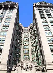 The upper floors contain the "H"-shaped plan and are designed to resemble a pair of three-bay-wide towers on both the Chambers and Reade Street sides. The windows facing the streets are rectangular, while the windows facing the light courts are progressively rounded and angled toward the interior of the light courts. There are nine bays facing the light court on Chambers Street and seven facing the Reade Street light court.[21][22] The third floor is treated as a "transitional" story and contains windows connected by geometric designs. The following ten floors, between the fourth and the thirteenth stories, consist of square-headed, copper-framed windows set back slightly between limestone piers. The fourteenth floor, another "transitional" story, sits atop a small cornice, and the windows are flanked by brackets supporting a much larger cornice. The fifteenth floor is designed as an attic with dormers. Heavy pediments atop the ends of both towers contain bee motifs evocative of the Barberini mercantile family, as well as large stone carvings of eagles and urns.[20][21] The western and eastern walls are relatively plain brick walls with few windows.[20][21] These walls contain painted signs with the bank's name, which date from the 1960s.[21]