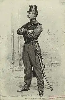 Hussars gained notoriety in the Grande Armée after the invasion of Egypt. At the Battle of Salalieh in August 1798, brigade commander Antoine Charles Louis de Lasalle fought "like a demon" and solidified his reputation as a maverick rider upon returning to France and receiving Weapons of Honour. At the ceremony (in a remark often mistakenly attributed to Napoleon), Lasalle quipped "Any hussar who isn't dead at age 30 is a layabout."[2] The hussars of Napoleon's army created the tradition of sabrage, the opening of a champagne bottle with a sabre. Moustaches were universally worn by Napoleonic period hussars, the British hussars were the only moustachioed troops in the British Army – leading to occasional taunts of "foreigner" from their brothers-in-arms. French hussars also wore cadenettes, braids of hair hanging to either side of the face, until the practice was officially proscribed when shorter hair became universal.