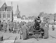 The regiment moved to its concentration area at Worthing on 9 June, then to the assembly area at Wanstead Flats, finally embarking aboard two LSTs at Victoria Hard in the Port of London on 25 June. It landed at La Valette on 28 June and concentrated at Lantheuil. The regiment fired its first rounds on 2 July in support of a Canadian attack on Carpiquet Airfield, and supported I Corps in the two-day battle for Caen (Operation Charnwood). On 10 July it moved to Colleville, where it was under fire and on 15 July a direct hit on a gun position killed the second-in-command (Maj W.K Crawford), the OC 235 Bty (Maj Arthur Toosey, brother of Philip) and an entire gun detachment (11 in all). Next day an OP was hit on Hill 112 with further casualties. It stayed for a month in these positions, before moving on 5 August to support the Canadian advance up the River Orne, then firing into the Falaise Pocket as the break-out from the Normandy beachhead began. There followed rapid movements across Northern France and Belgium. Regimental OP parties crossed the Seine with the assault troops of 15th (Scottish) Division, advanced in tanks with 7th Armoured Division, and then the regiment operated as 'Crawforce' (under the CO, Lt-Col D.I. Crawford) with heavy, medium, and anti-tank guns under command. The regiment reached Antwerp Airport with 53rd (Welsh) Division by 11 September.[79]
