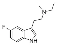 5-Fluoro-MET (5F-MET, 5-fluoro-N-methyl-N-ethyltryptamine) is a psychedelic tryptamine derivative related to drugs such as 5-Fluoro-DMT and N-Methyl-N-ethyltryptamine (MET). It acts as an agonist at the 5-HT2A receptor with an EC50 of 20.6 nM and produces a head-twitch response in animal studies. Ring fluorination in this case increases efficacy at 5-HT2A, with 5F-MET having an efficacy of 87.6% vs 5-HT, vs 36.2% for the partial agonist MET. It is claimed to have antidepressant activity.[1]