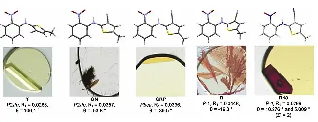 ROY has been crystallised in at least thirteen polymorphic forms.[7][8] Five of them, including red, orange and yellow examples are shown in Figure 1.