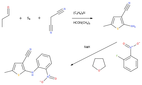 The preparation of ROY was first disclosed in a series of patents from Eli Lilly & Co. in the 1990s, which covered the pharmaceutical active ingredient later marketed as olanzapine. In the first step, a Gewald reaction using propionaldehyde, sulfur and malononitrile formed the thiophene ring system, as 2-amino-5-methylthiophene-3-carbonitrile. The amino group was then reacted with 2-fluoro-nitrobenzene in tetrahydrofuran to provide 5-methyl-2-[(2-nitrophenyl)amino]-3-thiophenecarbonitrile.[1]