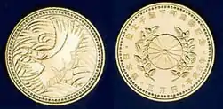 The 50,000 yen coin is a denomination of the Japanese yen. Only one coin was ever issued for this denomination which commemorated the wedding of Crown Prince Naruhito to Masako. These coins did not circulate, and were made in uncirculated and proof coinage format for collectors by the Japan Mint.