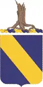 The regiment's crest shows a wreath of the colors (Or and Azure) a ragged tree trunk eradicated Proper. The shield is blue for Infantry, with the bend taken from the coat of arms of Alsace. The ragged tree trunk symbolizes the Meuse-Argonne operations.