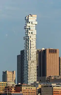 56 Leonard Street (known colloquially as the Jenga Building[2] or Jenga Tower[3] ) is an 821-foot-tall (250 m), 57-story[1] skyscraper on Leonard Street in the neighborhood of Tribeca in Manhattan, New York, United States. The building was designed by the Swiss architecture firm Herzog & de Meuron, which describes the building as "houses stacked in the sky."[4] It is the tallest structure in Tribeca.[5]