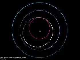 The orbit of 2020 AV2 is a well-secured with an uncertainty parameter of 2.[3][4] The asteroid orbits the Sun in approximately 151 days (0.41 years), with a semi-major axis of approximately 0.5554 AU.[4] 2020 AV2's orbit is close to a 3:2 mean-motion orbital resonance with Venus, meaning that ꞌAylóꞌchaxnim completes approximately three orbits for every two orbits completed by Venus.[17] The orbit of ꞌAylóꞌchaxnim is moderately eccentric, as it approaches only 0.457 AU from the Sun at perihelion, just within Mercury's aphelion distance of 0.467 AU.[3] ꞌAylóꞌchaxnim's orbit is also moderately inclined to the ecliptic by approximately 15.9 degrees.[3][8] ꞌAylóꞌchaxnim has a smaller orbital eccentricity and inclination compared to the generally expected values for typical Vatira asteroids, which were predicted to have an eccentricity around 0.4 and an inclination around 25 degrees.[17] The asteroid's minimum orbit intersection distance from Mercury and Venus is about 0.066 AU (9.9×106 km) and 0.079 AU (11.8×106 km), respectively.[4]