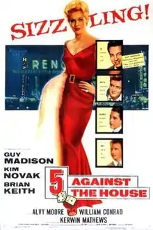5 Against the House is a 1955 American heist film directed by Phil Karlson and starring Guy Madison, Kim Novak and Brian Keith. The supporting cast includes William Conrad. The screenplay is based on Jack Finney's 1954 novel of the same name, later serialized by Good Housekeeping magazine.[1] The film centers on a fictional robbery of what was a real Nevada casino, Harold's Club.
