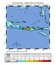 The earthquake occurred on 19:46 local time, at a depth of 31.0 km (19.3 mi) (USGS)[12] or 15.0 km (9.3 mi) (BMKG).[15] Shaking was felt as far away as Sumbawa in the east[16] and Trenggalek Regency in the west.[17][18] Shaking was also felt in Pacitan Regency, East Java.[19] The Indonesian Agency for Meteorology, Climatology and Geophysics (BMKG) stated that the epicentre of the earthquake was located inland, on the northeastern slopes of Mount Rinjani at 8.37°S 116.48°E. It initially measured the earthquake's magnitude at Mw 6.8, before revising it to 7.0.[15][20] The United States Geological Survey initially measured the earthquake at Mw 7.0, before revising it down to 6.9. It placed the epicenter at 8.287°S 116.451°E, somewhat north of the BMKG estimate.[12][21]