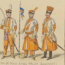 In 1764-89 officers wore green waistcoats with gold lace; officers and towarzycz white feathers, and all a white cockade; towarzyczy had a green belt/sash. - Gembarzewski, Bronisław (1925). Rodowody pułków polskich i oddziałów równorzędnych od r. 1717 do r. 1831 (in Polish). Warszawa: Towarzystwo Wiedzy Wojskowej. p. 14.