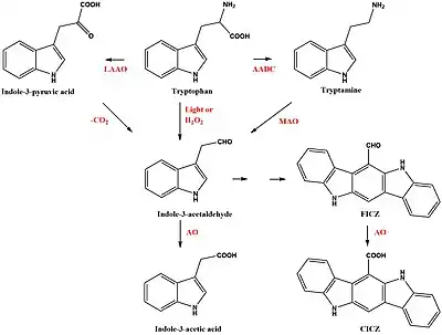In addition to the light- or H2O2-induced formation of FICZ, a number of other enzymatic pathways have been identified to convert Trp to FICZ via the precursor I3A.[2][3] Oxidative deamination of Trp by aromatic amino acid aminotransferases (ArAT) or L-amino oxidases (LAAO), one of which is the IL4-inducible enzyme IL4I1, converts Trp to indole-3-pyruvate, which after decarboxylation yields I3A. The enzyme aromatic L-amino acid decarboxylase (AADC) yields tryptamine via decarboxylation of Trp. Tryptamine can be oxidatively deaminated by monoamine oxidase (MAO-A and B) to produce I3A. Post incubation after deamination of the reaction mixture in the absence of an active enzyme generated FICZ and its oxidation product indolo[3,2-b]carbazole-6-carboxylic acid (CICZ). These non-enzymatic reactions were favored by low pH or increased temperature.[3]