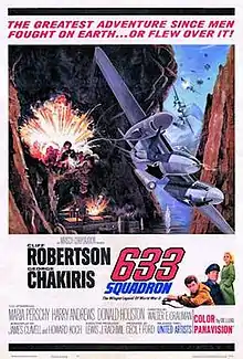 633 Squadron is a 1964 British war film directed by Walter Grauman and starring Cliff Robertson, George Chakiris, and Maria Perschy. The plot, which involves the exploits of a fictional World War II British bomber squadron, was based on the 1956 novel of the same name by former Royal Air Force officer Frederick E. Smith, which itself drew on several real RAF operations. The film was produced by Cecil F. Ford for the second film of Mirisch Productions UK subsidiary Mirisch Films for United Artists. 633 Squadron was the first aviation film to be shot in colour and Panavision widescreen.[3][4]