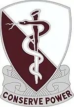 A Silver color metal and enamel device 1 1/4 inches (3.18 cm) in height overall consisting of a shield blazoned: Per bend Argent and Sanguine (Maroon), the staff of Aesculapius counterchanged. Attached below and to the sides of the shield a Silver scroll inscribed “CONSERVE POWER” in Maroon letters.[27]