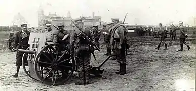 In addition to being used by Seebataillon units the 6 cm S-Bts K L/21 was used by the Schutztruppe in Germany's colonial empire. They may have been used before World War I during the Boxer Rebellion, the Herero Wars or the Maji Maji Rebellion. In the African theater of World War I, the SMS Königsberg sent its guns ashore to serve with the Schutztruppe in German East Africa in August 1914. Another two guns arrived in East Africa on board the blockade runner, SS Rubens in 1916.[6] Beginning in 1915, several naval infantry units armed with 6 cm S-Bts K L/21 guns were based in the Flanders region of Belgium. They are believed to have been used as infantry support guns due to their ability to be easily transported over soft ground.[3]