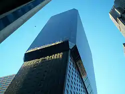 707 17th Street has a somewhat unusual "setfront" design, rather than the usual setback found in other Denver skyscrapers such as 1801 California Street.[8] The building bulges out and becomes wider at its 21st floor, and this widening is described as a "setfront".[8] The narrower region at the bottom of the building is home to the Hilton hotel, whereas the upper, wider floors contain most of the commercial space.[8] The building's façade is composed of black glass, and it is an example of international-style "black box" architecture.[1]