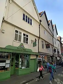 The houses lie on Low Petergate, one of the most important streets in the city centre, now a major shopping street.[1] In the 19th-century, the ground floors were converted into three shops, and the shop front of 77 survives, while the others were further altered in the 20th century.[2] With the later house at 71 Low Petergate, and the earlier ones at 79 and 81 Low Petergate, they form a lengthy range of timber-framed buildings which Nikolaus Pevsner described as "impressive".[1][3] The terrace has been Grade II* listed since 1954.[2]