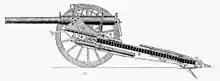 The gun has an upper and a lower gun-carriage. The upper gun-carriage slides, resting on grooves along the rail of the lower gun-carriage. In the trail is an oil buffer, acting as a recoil brake, which includes 40 india-rubber doughnuts which were compressed when the gun was fired. After the recoil stroke the doughnuts expanded again and the barrel returned into firing position.[8]