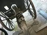 The 76 mm Mountain Gun Model 1909 was a breech-loaded howitzer made of steel with an interrupted screw breech and used fixed quick-fire ammunition. It had a box trail carriage, gun shield, two wooden-spoked steel-rimmed wheels, and a hydro-pneumatic recoil mechanism. For transport, the gun could be dismantled into seven mule loads or hooked to a limber and caisson for towing by a horse team when assembled.