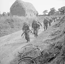 On 30 June 1944, the 76th Infantry (Reserve) Division, along with the other training divisions, had a combined total of 22,355 men. Of this number, only 1,100 were immediately available as replacements for the 21st Army Group.[25][lower-alpha 3] The remaining 21,255 men were considered ineligible for service abroad, due to a variety of reasons, ranging from medical, not being considered fully fit or not yet fully trained. Over the following six months, up to 75 per cent of these men would be deployed to reinforce the 21st Army Group, following the completion of their training and having met the required fitness levels.[26] Stephen Hart comments that, by September, the 21st Army Group "had bled Home Forces dry of draftable riflemen", due to the losses suffered during the Normandy Campaign, leaving the army in Britain, with the exception of the 52nd (Lowland) Infantry Division, with just "young lads, old men, and the unfit".[27] On 1 September 1944, the division was disbanded.[1] Utterson-Kelso assumed command of the 47th Infantry (Reserve) Division, which took over the role of the 76th Division.[22][28]