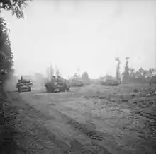 By early October the battalion's strength was just 10 officers and 194 men.[47] Nevertheless it returned to the line with 62nd Division for the attack on Solesmes on 20 October during the Battle of the Selle. The River Selle was crossed by wading and the town was captured before dawn by 186th Bde, then 185th Bde carried out the second phase of the attack with 1/5th Devons in support.[63][64][73][80][81] The division's final action of the war came on 4 November during the Battle of the Sambre, when it came up from reserve to cross the Rhonelle stream, 185th Bde pushing on to exploit the success. On the next two days the brigade, accompanied by Whippet tanks, headed the division's pursuit of the enemy against minimal resistance. On 9 November the division entered the fortress of Maubeuge, and two days later the Armistice with Germany came into force.[63][64][73][82][83][84]