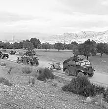 1/5th Devons missed the opening phase of the Battle of Nebi Samwil on 20 November, being detailed for escort duties, but on 23 November they took part in an attack on El Jib that ran into Turkish artillery and machine gun fire. Although it raced over the open ground in 'artillery order', the battalion's attacking force was reduced to six officers and 120 men pinned down behind the stone walls of an old vineyard. The Official History records that 'Many of the imperturbable Westcountrymen, ignoring their dangerous situation, went to sleep in the afternoon sunshine'.[47][50][51][58] When the battalion resumed the advance through the winter rains it was down to a strength of just 250 men, but was reinforced in late December.[47] After the Capture of Jerusalem 232nd Bde took part in a minor operation on 15 December to gain positions from which the artillery could reach enemy positions.[59]