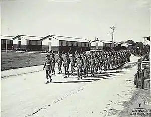 Troops of the Australian Special Wireless Group marching through their camp at Kalinga, Queensland, in July 1945.
