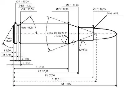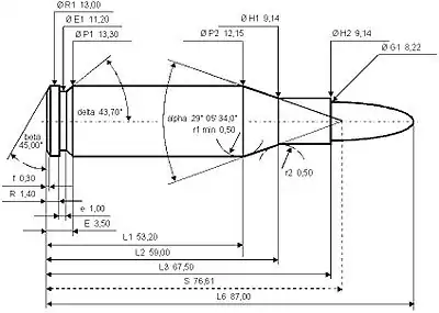 Americans would define the shoulder angle at alpha/2 ≈ 14.53 degrees. The common rifling twist rate for this cartridge is 280 mm (1 in 11.02 in), 4 grooves, Ø lands = 7.89 mm, Ø grooves = 8.20 mm, land width = 4.40 mm and the primer type is large rifle magnum.