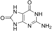 8-Oxoguanine (8-hydroxyguanine, 8-oxo-Gua, or OH8Gua) is one of the most common DNA lesions resulting from reactive oxygen species[2] modifying guanine, and can result in a mismatched pairing with adenine resulting in G to T and C to A substitutions in the genome.[3] In humans, it is primarily repaired by DNA glycosylase OGG1. It can be caused by ionizing radiation, in connection with oxidative metabolism.