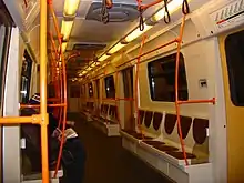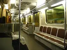 The new cars deviated significantly from the traditional design. The body is made of stainless steel, painted in a yellow-gray color scheme as opposed to the traditional blue color scheme used on previous models. The lead cars had a distinctive modern design at the cab end. Other improvements included the addition of ceiling fans (as opposed to air ducts used on the older series cars), cab air conditioning and heating systems, more standee room (increasing the capacity of each car by 30 - 40 people), bigger cab, and a new design of the trucks. The original design featured padded bench seats matching the contours of the human back, however this design was soon dropped and subsequent models were built with the standard anti-vandal plastic seats. The cars had DC-120 type traction motors (4 per car) and a thyristor-pulse control system developed by AEC "Dynamo", as well as regenerative braking, recycling energy back into the third rail, allowing the cars to operate smoother, quieter, and more efficiently. The maximum design speed was increased to 100 km/h vs 90 km/h for the 81-717/714 and earlier classes of cars due.