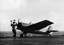 ![]() A Grumman Martlet fighter of 811 Squadron lands on HMS Biter after a successful action against a German Junkers Ju 290, February 1944 | |