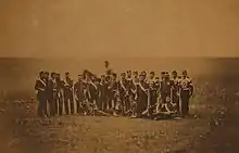 The 1st Battalion then retreated, with the rest of Wellesley's army, to the Lines of Torres Vedras.[15] The battalion, still under the command of Lieutenant-Colonel Wallace made another bayonet charge at the Battle of Fuentes de Oñoro in May 1811 and drove the French Army from the village.[16] It went on to fight at the Siege of Ciudad Rodrigo in January 1812[17] and scaled the walls of the fortress at the Siege of Badajoz in April 1812.[18] At the Battle of Salamanca in July 1812 the battalion was at the centre of the brigade as it advanced and routed the French troops.[19] At Salamanca the battalion captured an old Moorish standard adorned with crescents and bells: the standard, more correctly known as a Turkish crescent, became known in the regiment as the "Jingling Johnny".[20]