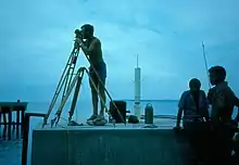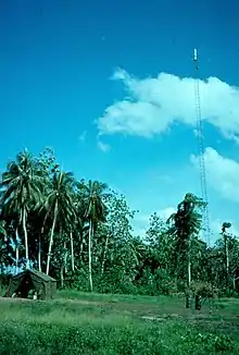 A cornerstone of the high quality scale 1:100,000 topographic line maps produced of the entire country in the 1970s was the geodetic survey on which the topographic survey was based. The high order astronomic/triangulation/trilateration network through the Papua and New Guinea highlands was undertaken by Australia's Division of National Mapping (DNM) 1962–1965.[10] At the same time (1962 and 1963) Topo Sqn AHQ Svy Regt undertook a high order coastal traverse around mainland Papua and New Guinea with intersections to the DNM highlands survey when the beacons were visible.[11] The rapid progress of surveys in the 1960s would not have been possible if it was not for the technological development of the microwave electromagnetic distance measurement man-portable system Tellurometer and using helicopters capable of positioning and resupplying survey parties on high altitude survey stations between 10,000 feet and 15,000 feet above sea level. In 1963 the Australian Government was very concerned about the land border with Indonesia an area very poorly mapped. RA Svy used a new Radar Airborne Profile Recorder to map the border area which required additional horizontal and vertical control such that height contours could be mapped. In 1964, Topo Sqn AHQ Svy Regt undertook a three-year program of topographic survey control for scale 1:100,000 mapping of a three degree longitude band east of the land border. Horizontal control was by trilateration network using a new airborne electromagnetic distance measurement system, Aerodist MRC2, connected to the high order surveys established by RA Svy and DNM 1962 -1965. [12] Mixed results were achieved with mapping photography of the border area in the 1960s. At the same time a US Air Force airborne High Frequency Ranging and Navigation (HIRAN) trilateration network measuring long lines between ground stations connected Australia, Papua, New Guinea, New Britain, New Ireland and Buka (Bougainville) to a wider South West Pacific Survey to the north-east.[13] All of these surveys contributed to the 1966 Australian geodetic network adjustment and the resulting coordinate set in the Australian Geodetic Datum 1966. Australia had decided to map the entire Territory at scale 1:100,000 and control surveys for the remainder of mainland PNG were taken up on operations from four to nine months long by Northern Command Field Survey Unit/1 Fd Svy Sqn (Brisbane) mainly using Aerodist MRC2 in 1969 and 1970, and by 4 Fd Svy Sqn (Adelaide) mainly using Aerodist MRB3/201 (computer assisted) from 1972 to 1974 and portable Transit Doppler satellite (US Navy navigation satellites) AN/PRR-14 Geodetic Receiver (Geoceivers) in 1974. In 1970 a British Royal Engineer Survey Troop was attached to 1 Fd Svy Sqn. Vertical (height) control for the mapping was a combination of trigonometric heighting, barometric heighting by Army Sioux helicopter, levelling with connections to sea level and WREMAPS II Airborne Profile Recorder (APR).[6][9][14][15]