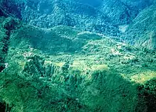 Villages in the mountains of the Huon Peninsula - The New Britain 1st Order Laplace astro-geodetic traverse was completed from Long Island in the middle of Vitiaz Strait connected to a high order RA Svy survey station, established 1962–64, near Saidor, New Guinea. The Long Island survey point on top of the highest point (1,280 metres or 4,200 feet) overlooked the huge volcanic crater Lake Wisdom. A volcano in the middle of the lake was active from time-to-time during the survey occupation, with ash and lava spouts sometimes above the lake surface and sometimes only surface bubbles. Volcanic activity was reported to Rabaul Vulcanology Observatory. Theodolite observations were interrupted by minor seismic/volcanic activity evident by the very sensitive theodolite level bubbles racing back-and-forth along their tubes.[3]